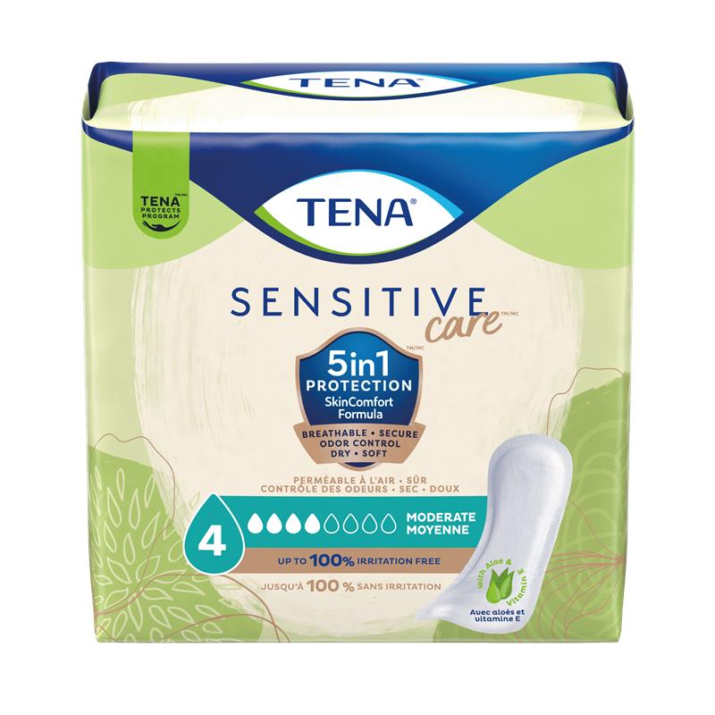 Try our TENA Sensitive Care Pads which are enriched with our SkinComfort Formula with a skin friendly layer, in combination with our soft and 100% breathable materials, helps protect intimate skin.